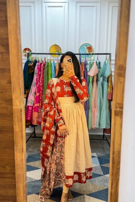 Elegant Red & Beige Printed Cotton Kurti Set with Dupatta