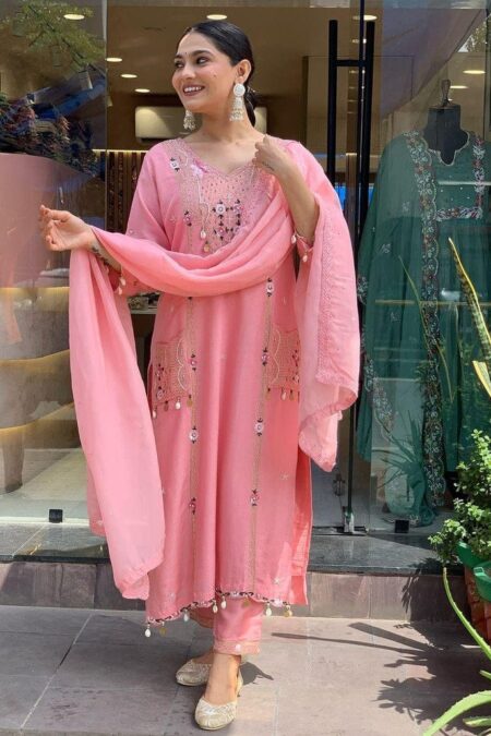 Pink Pure Roman Silk Embroidered Suit with Dupatta – Cowry & Sequin Festive Wear for Women