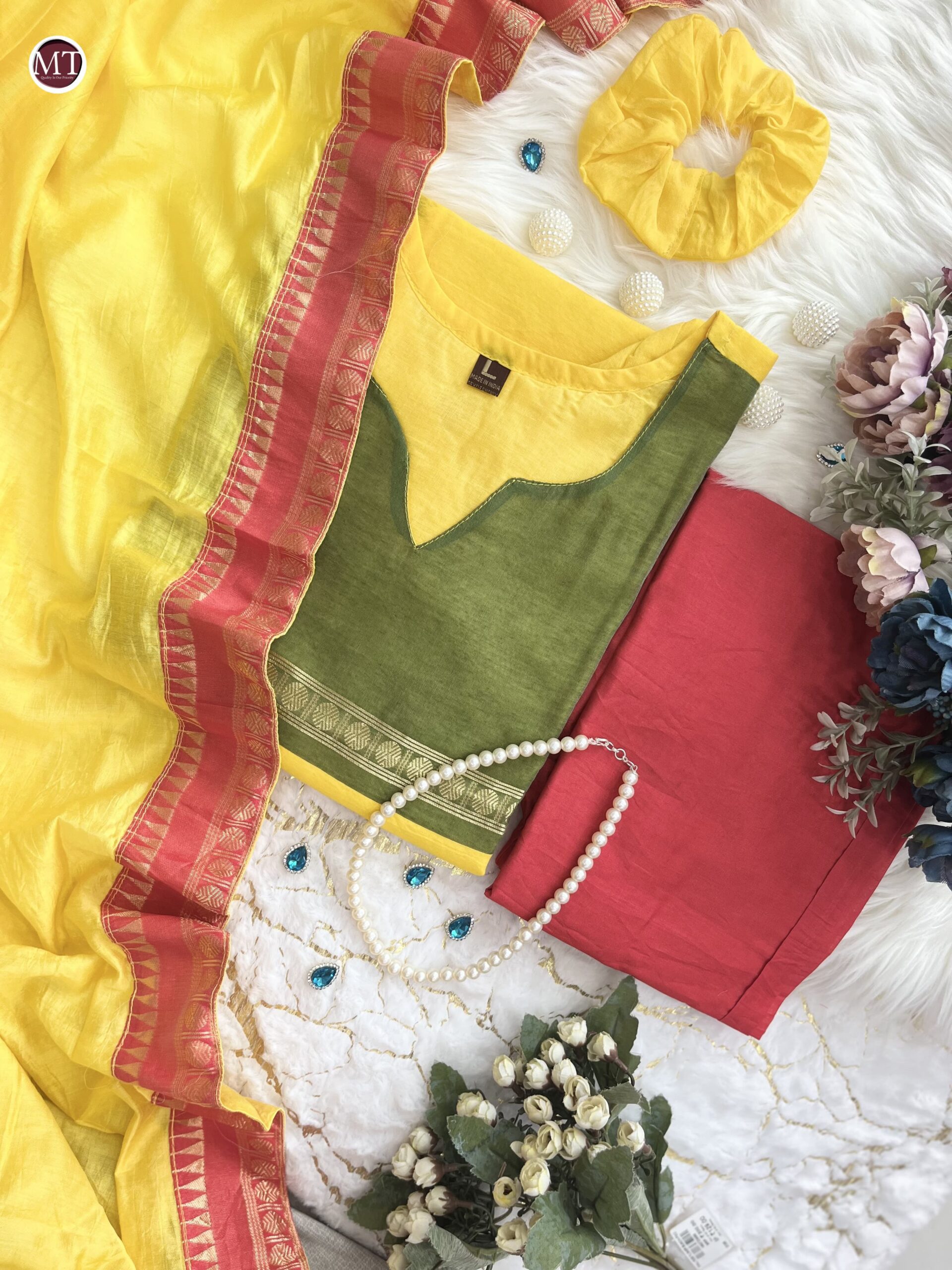 Introducing our New Arrival – Varanika/Kasturi Premium Suit Set from our Branded Collection! Crafted from pure Kanchi cotton, this elegant yellow ensemble is designed with love and rooted in South Indian cultural artistry. It features a jacquard woven dupatta, traditional motifs, and hand zari weaving, making it a timeless addition to your wardrobe.