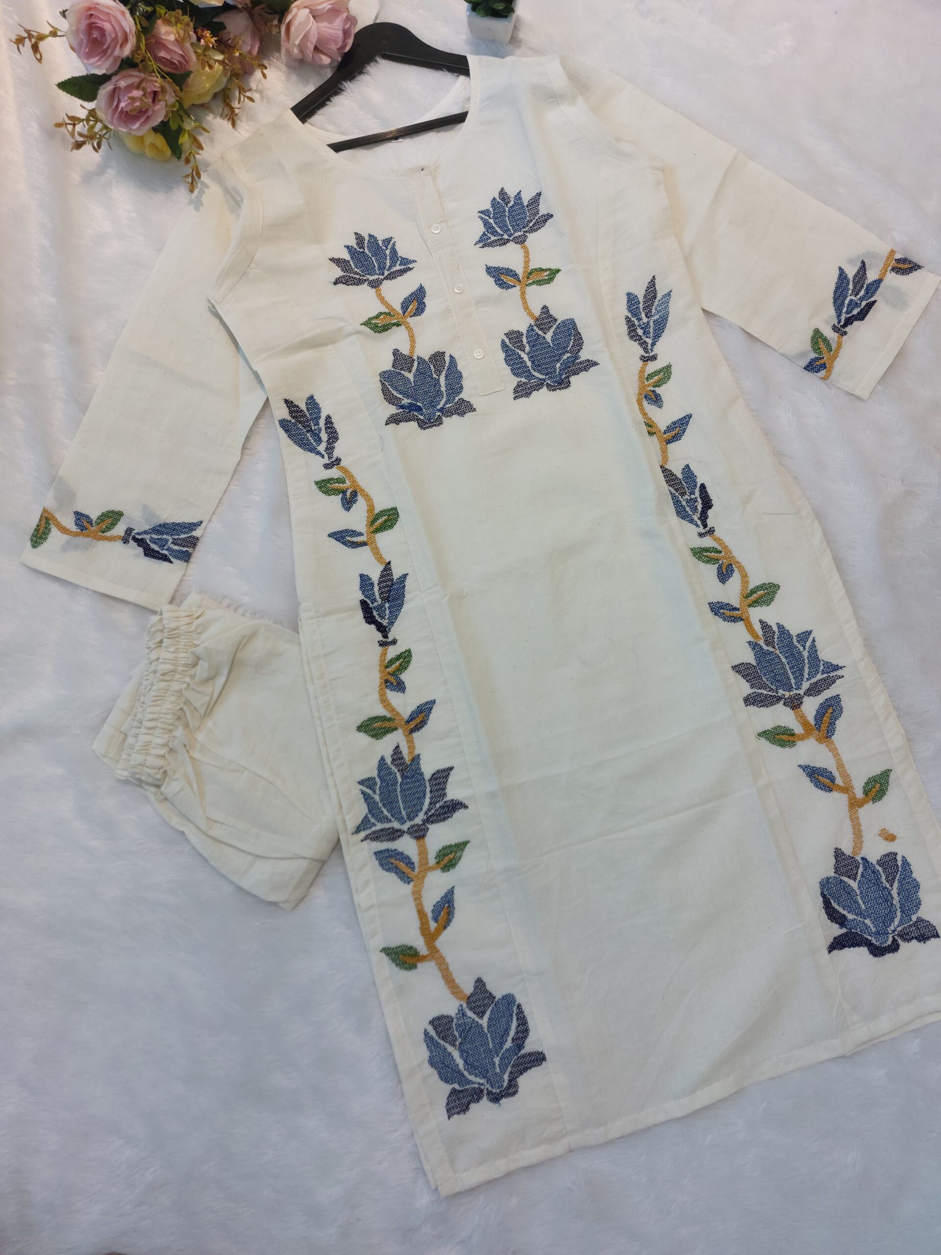 🔹 Color – Soft Off-white/Cream with colorful embroidery